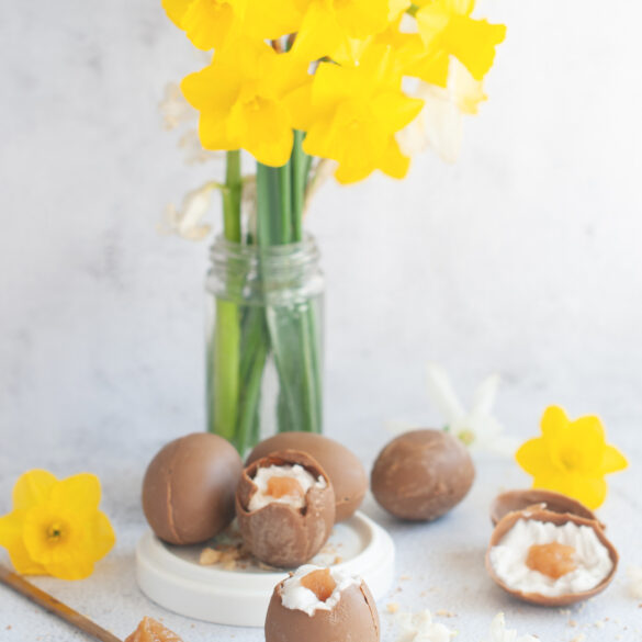 Завършвам поредицата за Великден с тези симпатични шоколадови яйца с пълнеж от кокосова сметана и домашно сладко от круши.